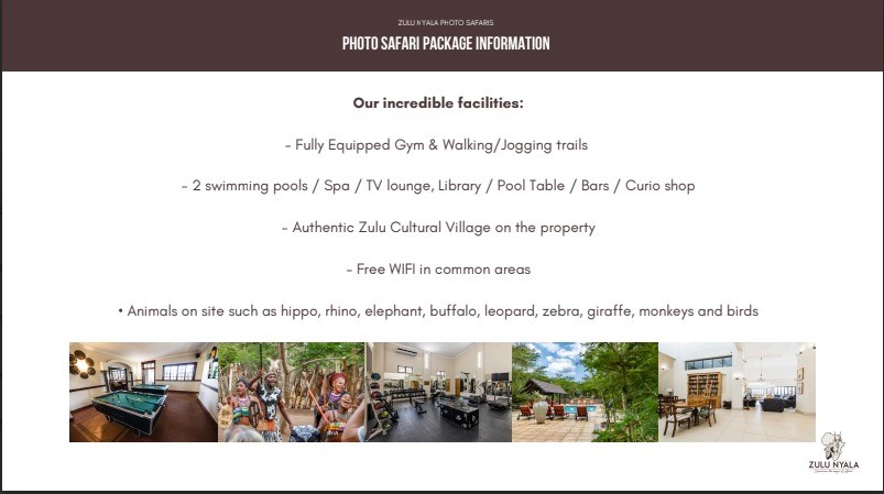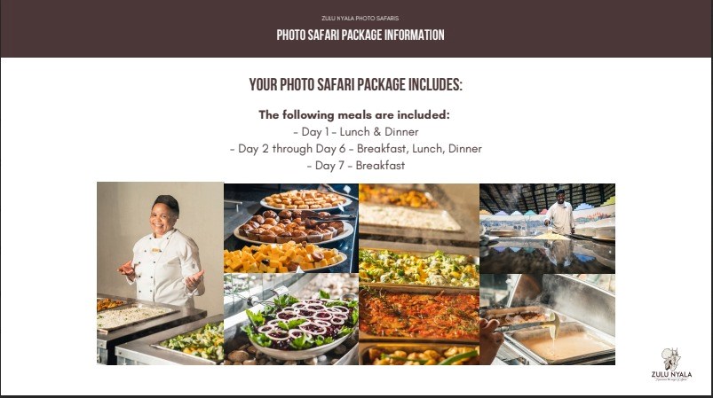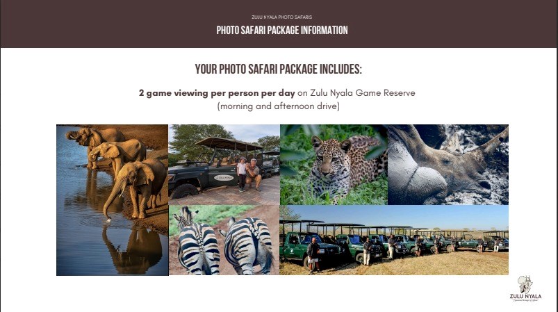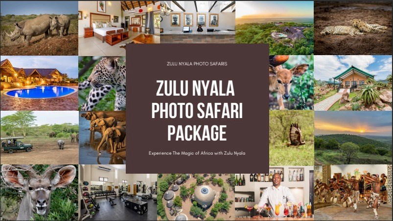 South Africa Photo Safaris Vacation Package 6 nights’ accommodation for 2 people at Zulu Nyala Heritage Safari Lodge, Tented Camp (depending on availability - Classic (Room or Luxury Tent) - 2 game viewing per person per day on Zulu Nyala Game Reserve (morning and afternoon drive) The following meals are included: - Day 1 – Lunch & Dinner - Day 2 through Day 6 – Breakfast, Lunch, Dinner - Day 7 – Breakfast
