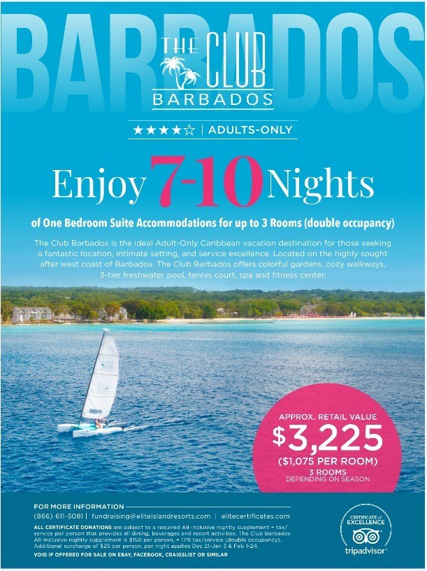 Discover the beauty, charm, and warmth of the Caribbean with a stay at one of Elite Island Resorts’ award-winning beachfront properties. From Antigua and Barbados to St. Lucia, Panama, and beyond, each resort offers stunning ocean views, white-sand beaches, and authentic island hospitality. Guests will enjoy spacious accommodations, endless activities, and an array of dining options featuring local and international cuisine. Whether you’re seeking relaxation in a hammock under the palms, thrilling water sports, or vibrant cultural experiences, Elite Island Resorts provides the perfect blend of adventure and tranquility. With all-inclusive amenities and breathtaking settings, this is your chance to experience the ultimate Caribbean escape. Each Certificate offers resort accommodations and is subject to a required nightly all-inclusive supplemental fee per person, based on double occupancy. The Certificate Winner is responsible for their air transportation and the all-inclusive supplemental fee which covers food and beverages (including alcohol), resort amenities/activities. All reservations are subject to a minimum supplement of $150.00 per day per person that provides dining, beverages (including alcohol) resort facilities and activities. Must book by (not travel) by June 30 2028