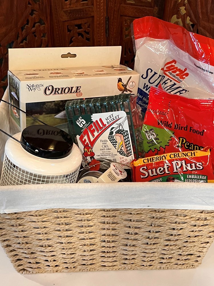 Basket of everything you need to entice birds to your backyard! Contents: Oriole feeder, seed feeder and wild bird mix, hummingbird feeder and nectar concentrate, suet basket and suet, Nyjer Sack, and peanut suet nuggets.