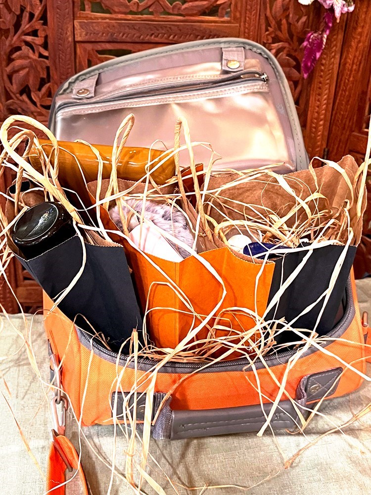 Personal care products in an orange carry bag. Contains: Sexy Hair Root Pump Plus, Sleeping Mask, Headband, Bloomingdale's Little Brown Cosmetic Bag, Wow Shampoo, Nfuse Body Lotion, Ernolaszlo Cleansing Set, Amarige Body Lotion, Multi-Vitamin Face Mask, Makeup Setting Spray, and Facial Sponges.