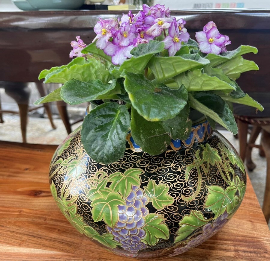 Add a touch of natural beauty and cultural charm to your space with this blooming African violet, thoughtfully planted in a lovely bowl featuring an Asian-inspired motif. The vibrant purple blossoms contrast beautifully with the elegant design of the bowl, making this a perfect accent for a windowsill, desk, or coffee table.