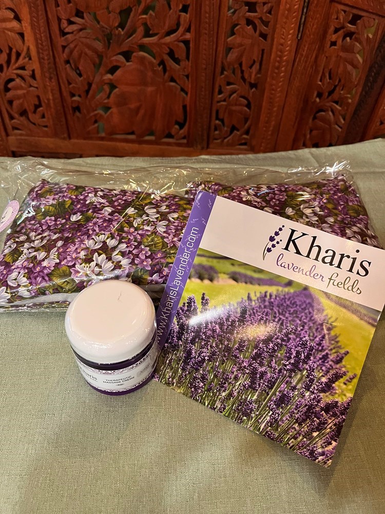 Lavender therapeutic massage cream with calm and comfort body & neck wrap from Kharis Lavender Fields, Gaithersburg, MD. We have built a local business known for our picturesque lavender farm with high-quality products and services. We provide work opportunities to those in poverty, specifically women in my homeland of Bolivia. We take pride in being actively involved with our Greater Washington Community, particularly Montgomery County, by participating in farmers markets, partnerships with local honey producers, and family activities held at our farm location. Our beautiful lavender fields and farm are an ideal setting for photography sessions, small group courses and our lavender kitchen experiences.