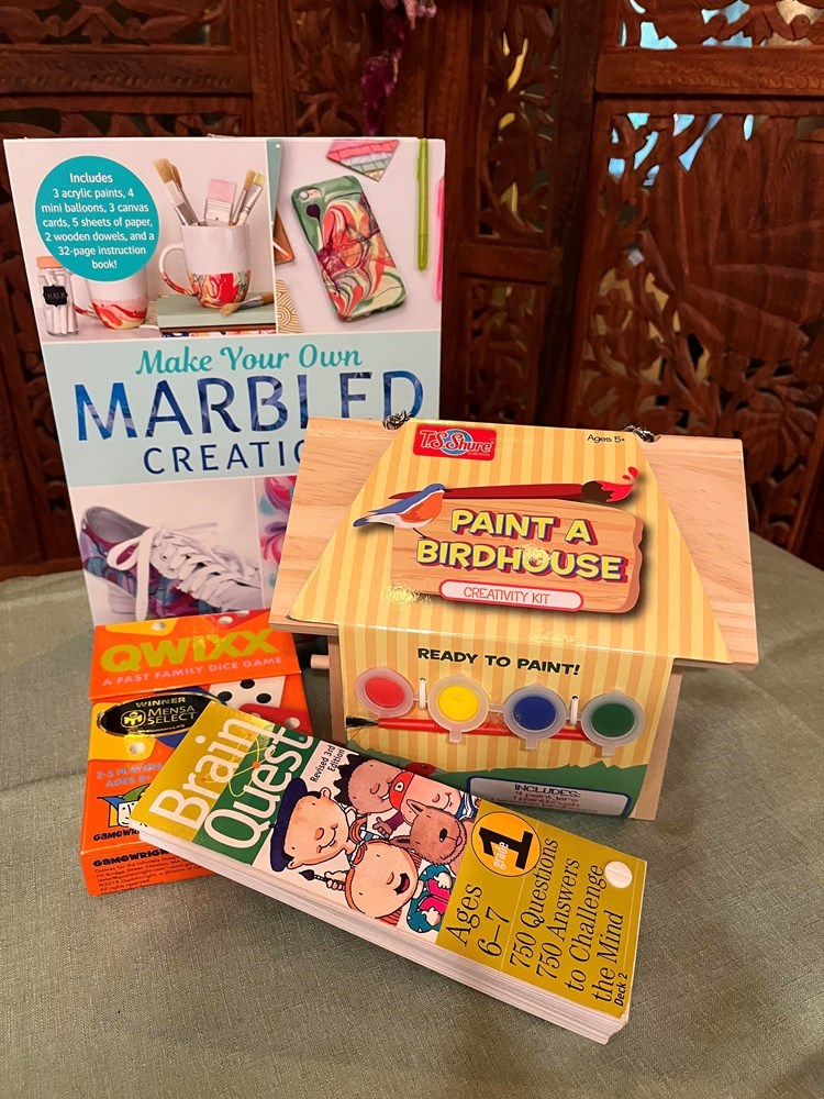 Contents: Qwixx game, Brain Quest ages 6-7, Make-Your-Own Marbled Creations, and Paint A Birdhouse.