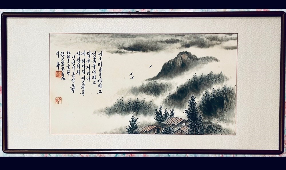 Ink and light color on paper, framed under glass, ca. late 20th century A serene Korean ink painting by Seong Woo Chul, combining expressive brushwork with poetic calligraphy. A cluster of mountain cottages emerges through drifting mist, while the accompanying verse evokes solitude and reflection amid nature’s quiet expanse. The artist’s seal appears in red, balancing the composition’s poetic and pictorial harmony.