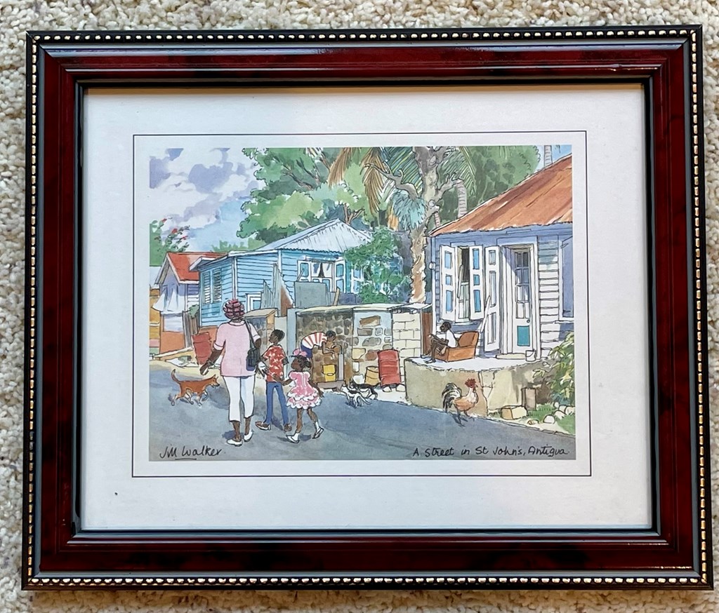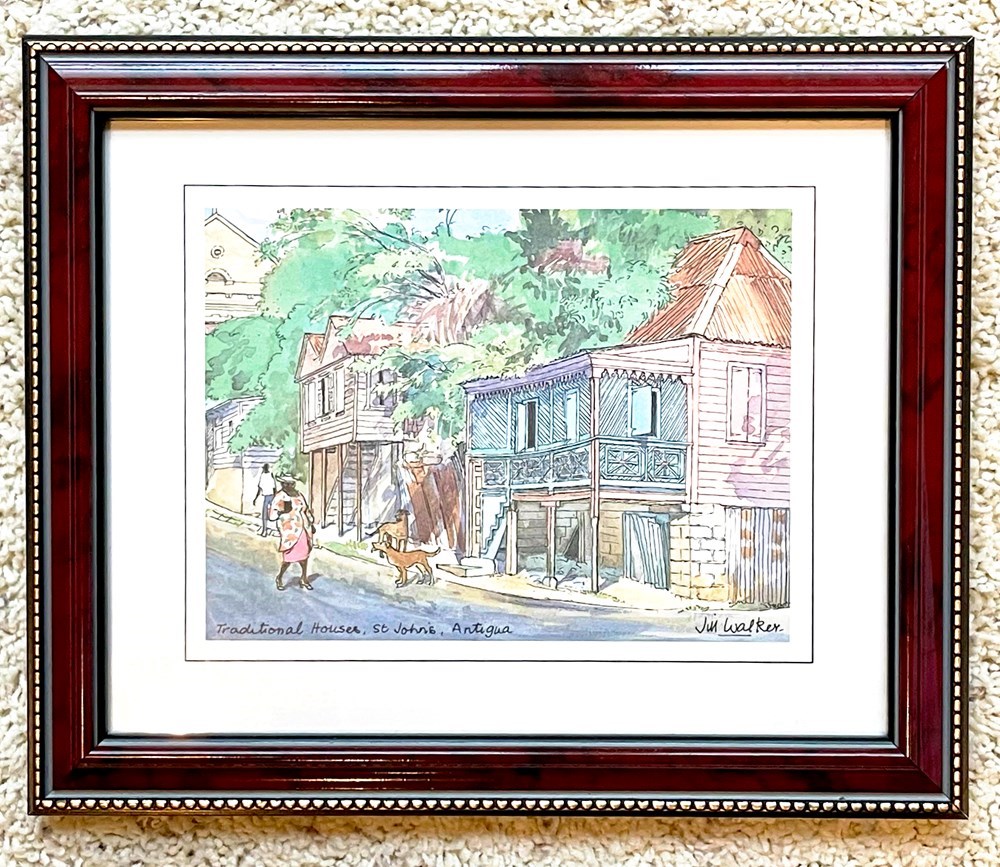 JM Walker (20th C.) — Two Watercolors of St. John’s, Antigua “Traditional Houses” and “A Street in St. John’s” Watercolor on paper, matted and framed under glass. Charming street scenes with lively figures and vernacular island architecture, rendered in bright Caribbean colors. Nicely presented in matching mahogany-toned frames with beaded gilt trim.