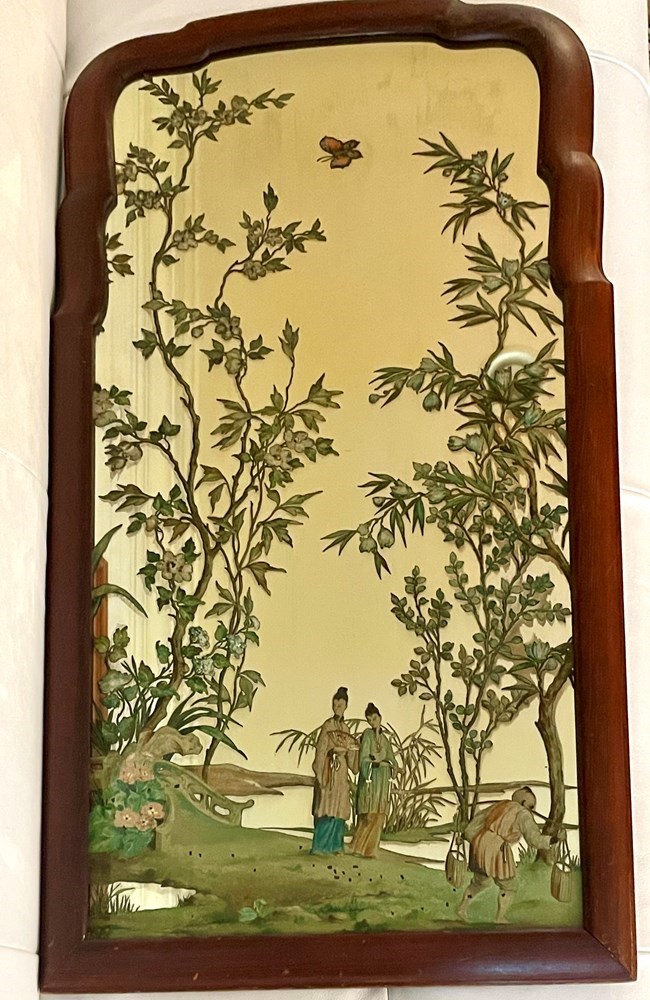 Hand-painted figures in a garden scene on reverse glass, wood frame with brass mounts.