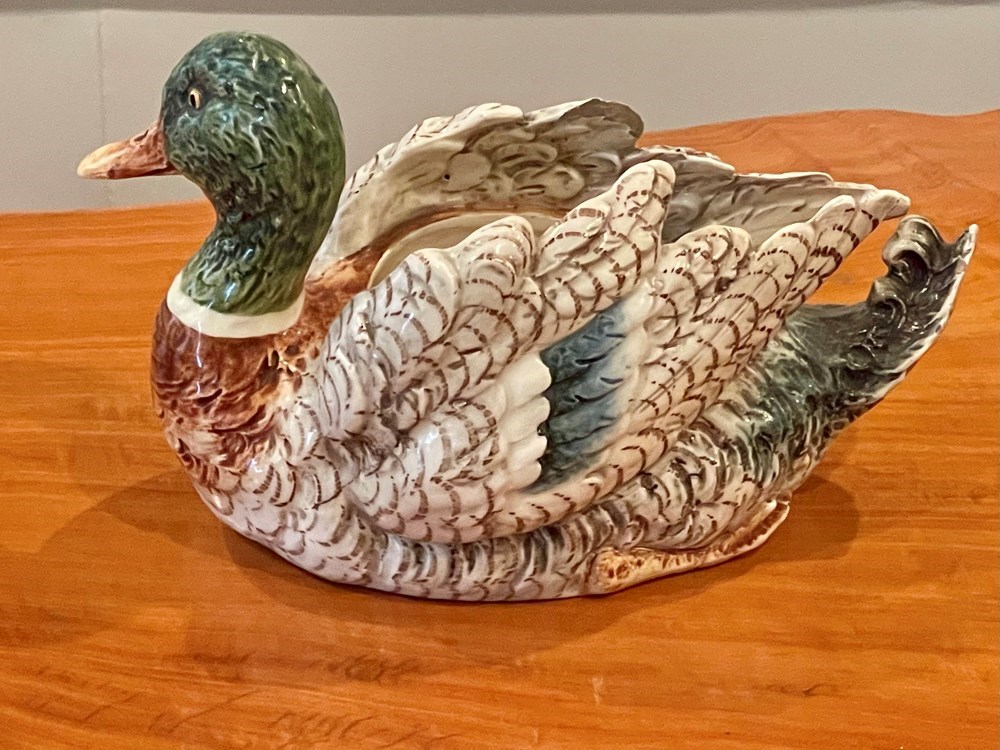 Hand-painted glazed ceramic duck approx. 12 in. long. Realistic detail, mid-century decorative import.