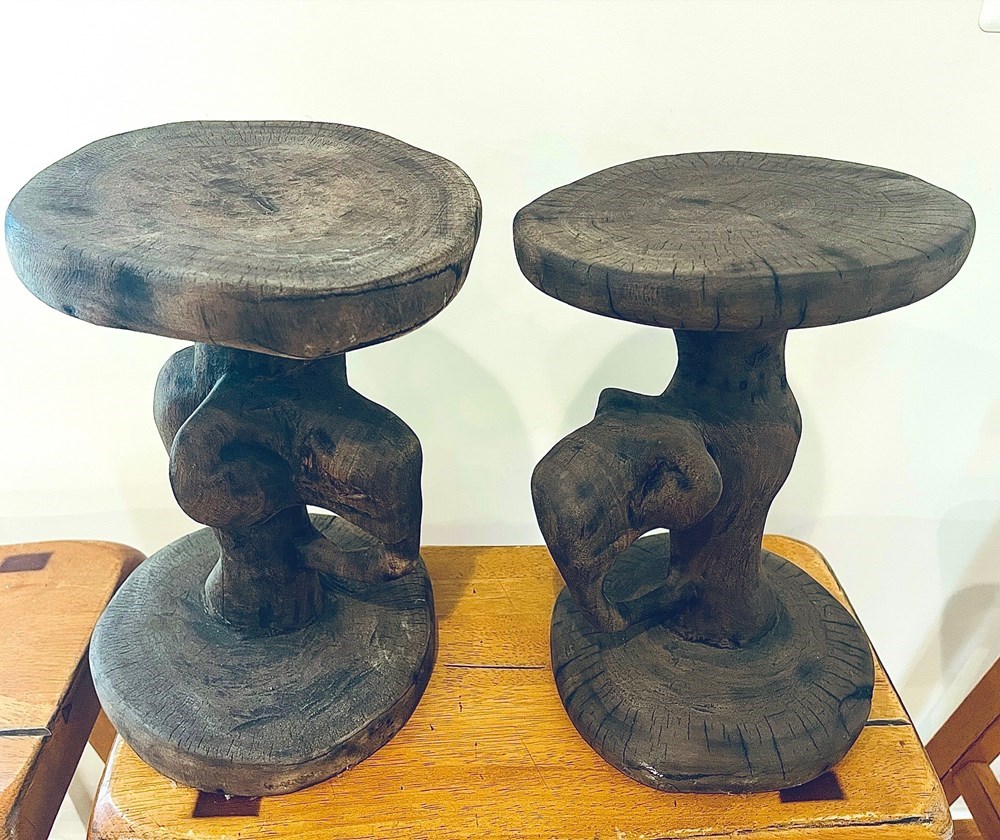 Solid wood stands carved with elephant-head supports, 14 in. high. Rustic patina, possibly Thai or African origin.