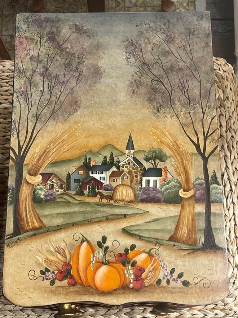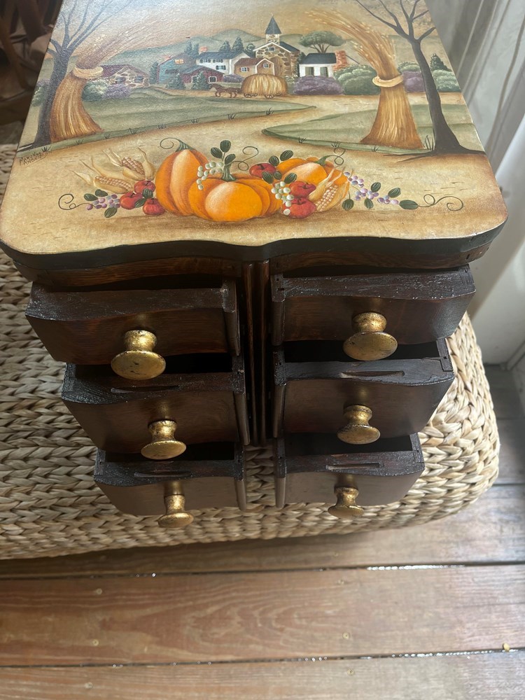 Signed, hand-painted antique decorative table-top chest. Mary Kay Anderson.