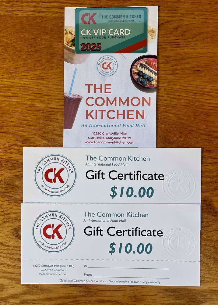 $20 Common Kitchen gift cards plus CK VIP card for 10% off (good through 12/31/25). The Common Kitchen is a place where emerging food entrepreneurs can thrive and grow, supported by one another, the local community, and a fully-equipped commercial kitchen accompanied by retail spaces, seating, and a bar serving locally roasted coffee, local draft beer, and, hand crafted cocktails.